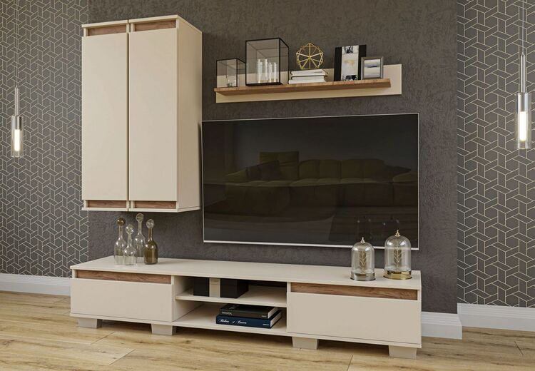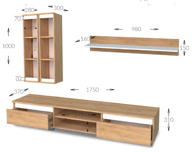 Levná obývací stěna v moderním barevném provedení se stane výrazným prvkem každé místnosti. Kombinace barvy satin s dekoračními lištami z MDF kraft dubu tabaco barvy. Nábytek je vyroben z kvalitního lamina hraněného melaninem. Sestava se skládá z ( šířka/hloubka/výška ) – televizní stolek se 2 zásuvkami ( 175,2 × 37 × 31 cm ),2× závěsná skříňka 1-dveřová ( 28 × 30,6 × 100,2 cm ) a police ( 98,2 × 16 × 15 cm ). Tato stěna se prodává jako sestava, jednotlivé díly nelze koupit zvlášť. Dodáváme v demontovaném stavu.CASA 83071