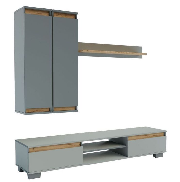 Levná obývací stěna v moderním barevném provedení se stane výrazným prvkem každé místnosti. Kombinace šedé činčila barvy s dekoračními lištami z MDF barvy dub kraft zlatý. Nábytek je vyroben z kvalitního lamina hraněného melaninem. Sestava se skládá z ( šířka/hloubka/výška ) – televizní stolek se 2 zásuvkami ( 175,2 × 37 × 31 cm ),2× závěsná skříňka 1-dveřová ( 28 × 30,6 × 100,2 cm ) a police ( 98,2 × 16 × 15 cm ). Tato stěna se prodává jako sestava, jednotlivé díly nelze koupit zvlášť. Dodáváme v demontovaném stavu.CASA 83071