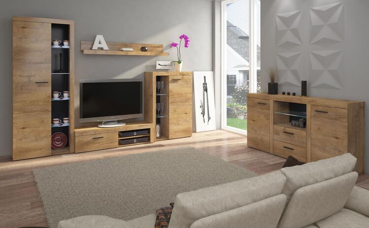 Moderní obývací stěna, která si zakládá na nejnovějších trendech bydlení. Nábytek je vyroben z kvalitního lamina. Sestava se skládá z ( šířka/hloubka/výška ) – TV stolek ( 120 × 40,3 × 31,5 cm ),vysoká vitrína ( 75 × 33,9 × 190 cm ),nízká vitrína ( 75 × 33,9 × 117 cm ) a police ( 140 × 17,6 × 16 cm ). Korpus i dvířka jsou v barvě dub lefkas. Tato stěna se prodává jako sestava, jednotlivé díly nelze koupit zvlášť. Ve vitrínách jsou skleněné police. LED osvětlení není v ceně, možnost dokoupení. Dodáváme v demontovaném stavu.CASA 87008