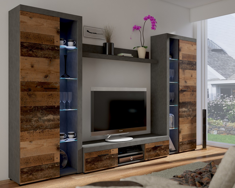 Moderní obývací stěna, která si zakládá na nejnovějších trendech bydlení. Nábytek je vyroben z kvalitního lamina. Sestava se skládá z ( šířka/hloubka/výška ) – TV stolek ( 150 × 40,2 × 31,5 cm ),2× vysoká vitrína ( 75 × 33,8 × 190 cm ) a police ( 140 × 17,6 × 16 cm ). Dvířka jsou v barvě lamina dub old style, korpus matera (černošedá). Tato stěna se prodává jako sestava, jednotlivé díly nelze koupit zvlášť. Ve vitrínách jsou skleněné police. LED osvětlení není v ceně, možnost dokoupení. Dodáváme v demontovaném stavu.CASA 87008