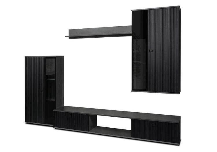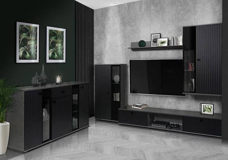 Moderní obývací stěna SALSA. Nábytek je vyroben z kvalitního lamina. Sestava se skládá z vitríny 59 × 31 × 115, TV stolku 176 × 40 × 28, závěsné vitríny 59 × 31 × 113 a police 102 × 18 × 16 cm. Obývací stěna je v barvě černá/matera. Sklo ve vitríně je čiré. Tato stěna se prodává jako sestava,... více informací o zboží