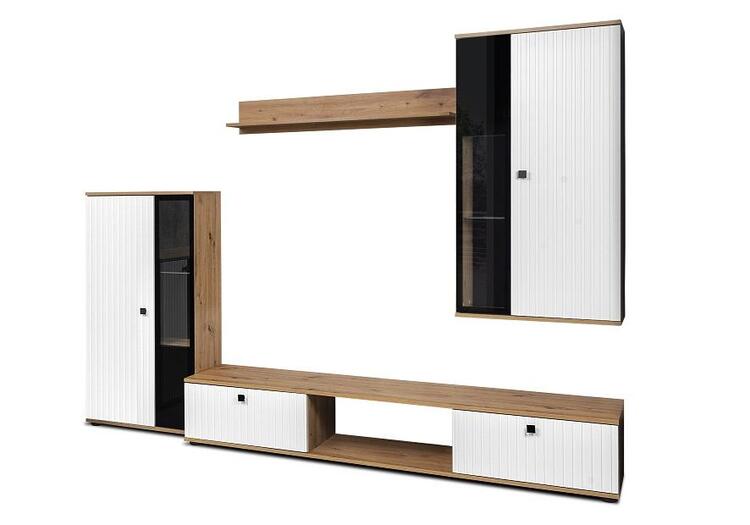 Moderní obývací stěna, která si zakládá na nejnovějších trendech bydlení. Nábytek je vyroben z kvalitní desky LTD v barevném provedení bílá/dub artisan. Sestava se skládá ze dvou vitrín, televizního stolku a police a prodává se pouze jako sestava. Prostor pro televizi je – výška 91 cm, šířka... více informací o zboží