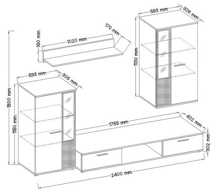 Moderní obývací stěna, která si zakládá na nejnovějších trendech bydlení. Nábytek je vyroben z kvalitní desky LTD v barevném provedení bílá. Sestava se skládá ze dvou vitrín, televizního stolku a police a prodává se pouze jako sestava. Prostor pro televizi je – výška 91 cm, šířka 132 cm. Dodáváme v demontovaném stavu.CASA 87009