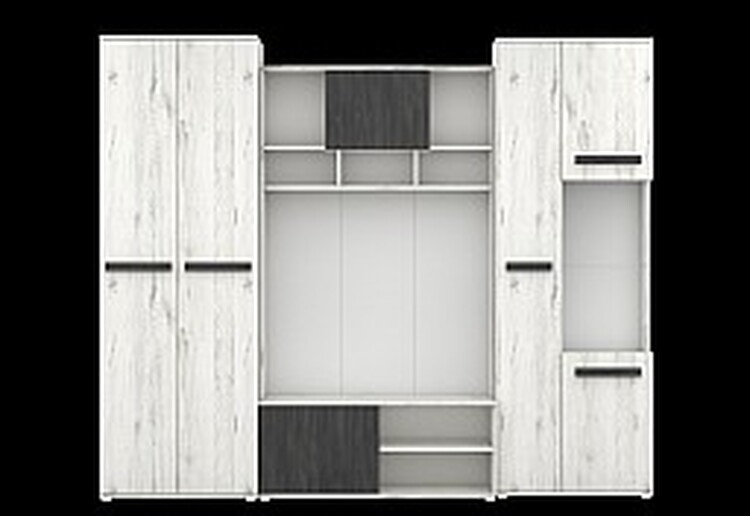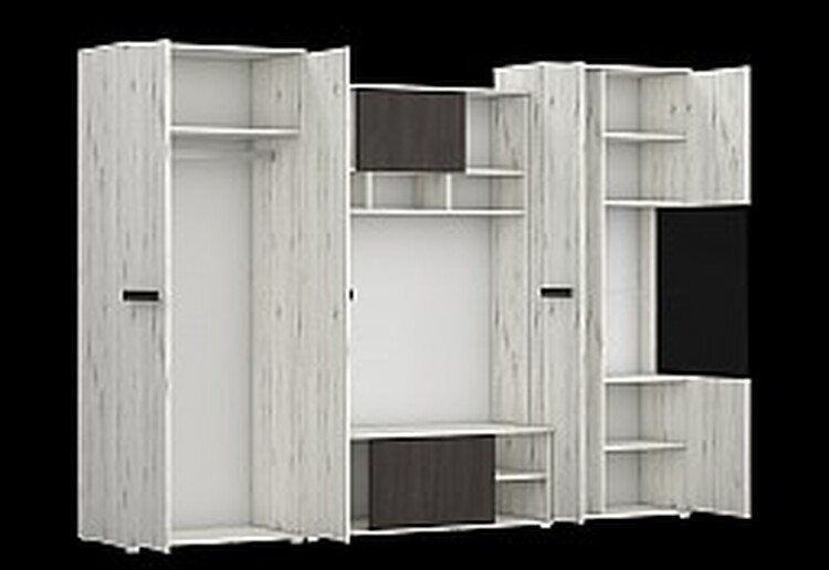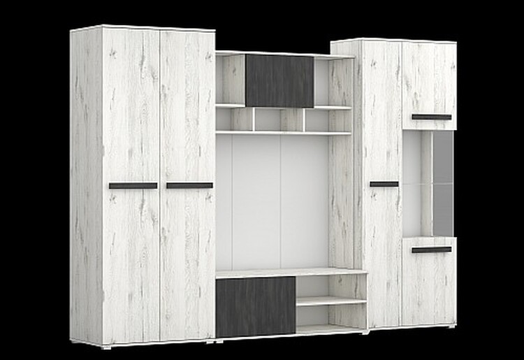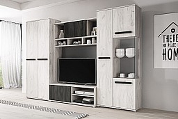 Sestava zahrnuje:• Šatní skříň s šatní tyčí a vnitřní policí – pro oděvyi úložné boxy,• TV komodu s dostatečnou plochou a úložným prostorem,• Nástavbu nad komodou – police a uzavřené úložné plochy,• Vitrínu s prosklenými dvířky – možnost doplnění LED osvětlení(není součástí),• Nástěnnou polici pro knihy nebo dekorace.