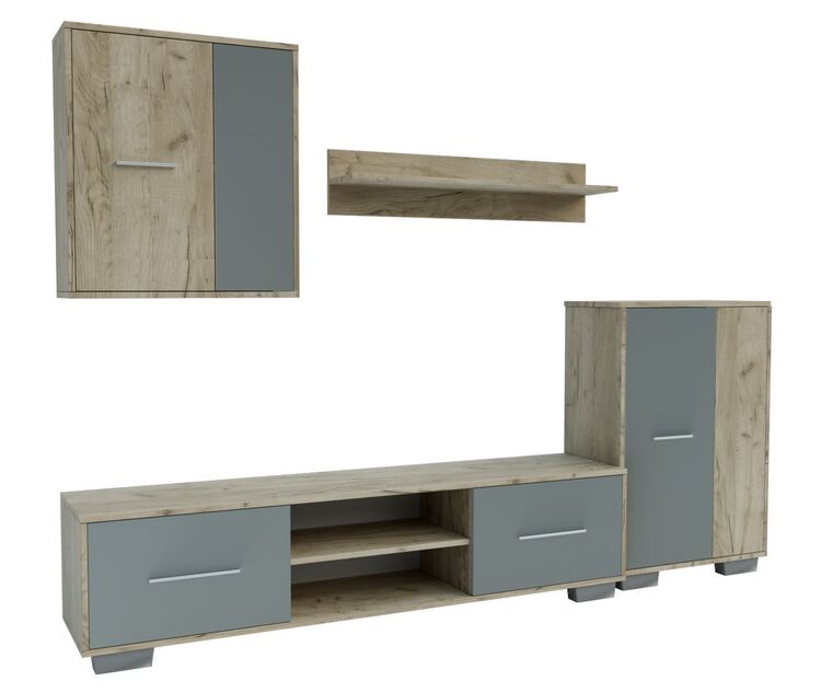 Moderní obývací stěna vhodná i do menších bytů. Tato sestava je vyrobena z kvalitního lamina. Sestava se skládá ( šířka/výška/hloubka ) – TV stolek ( 160 × 39 × 38 cm ),nástěnná skříňka ( 60 × 67 × 22 cm ),komoda ( 60 × 89 × 30 cm ) a police ( 90 × 19 × 19 cm ). Korpus a část předních dvířek je barvy dub kraft šedý, dvířka jsou doplněna o barvu šedá činčila. Tato stěna se prodává jako sestava, jednotlivé díly nelze koupit zvlášť. Dodáváme v demontovaném stavu.CASA 83032