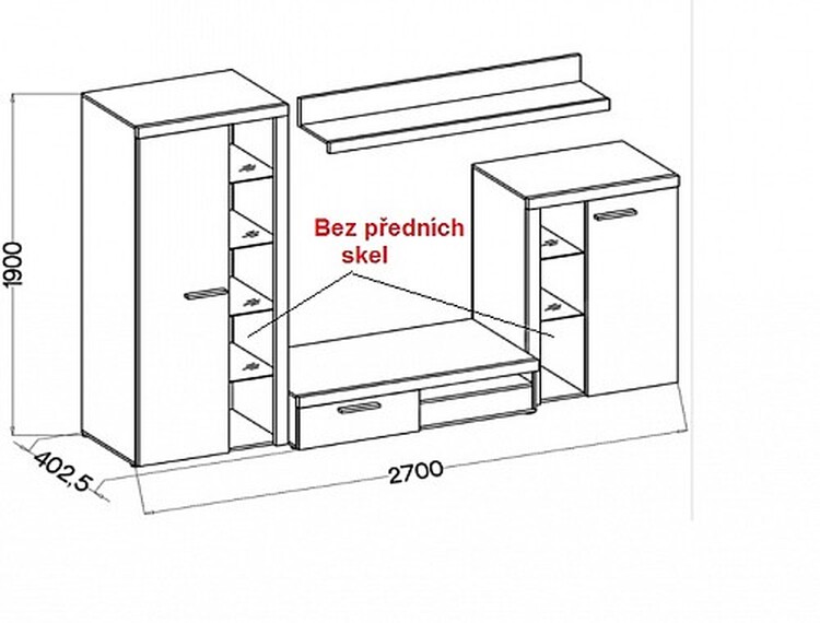 Obývací stěna v moderním provedení o celkové šířce 270 cmpřináší kombinaci funkčnosti a jednoduchého designu. Sestava je tvořenadvěma vitrínami, TV stolkem a nástěnnou policí, díky čemuž nabízídostatek úložného i odkládacího prostoru.