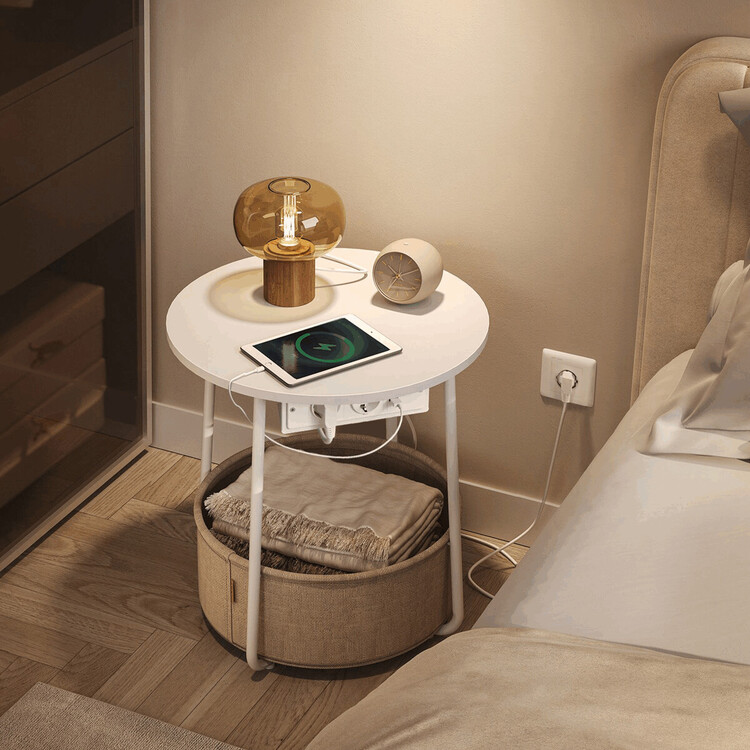 Odkládací stolek s elektrickou zásuvkou a USB porty nabízí praktické řešení pro moderní domácnosti i kanceláře. Kulatá deska o průměru 45 cm je vyrobena z MDF v bílé barvě s hladkým povrchem, který se snadno udržuje. Pevné kovové nohy v bílé barvě zajišťují stabilitu a dlouhou životnost stolku. Pod deskou je umístěn textilní koš v přírodním odstínu, který poskytuje dodatečný úložný prostor pro drobnosti. Integrovaná elektrická zásuvka se dvěma standardními výstupy a dvěma USB porty umožňuje pohodlné napájení elektroniky přímo u stolu, což zvyšuje jeho funkčnost a komfort užívání.