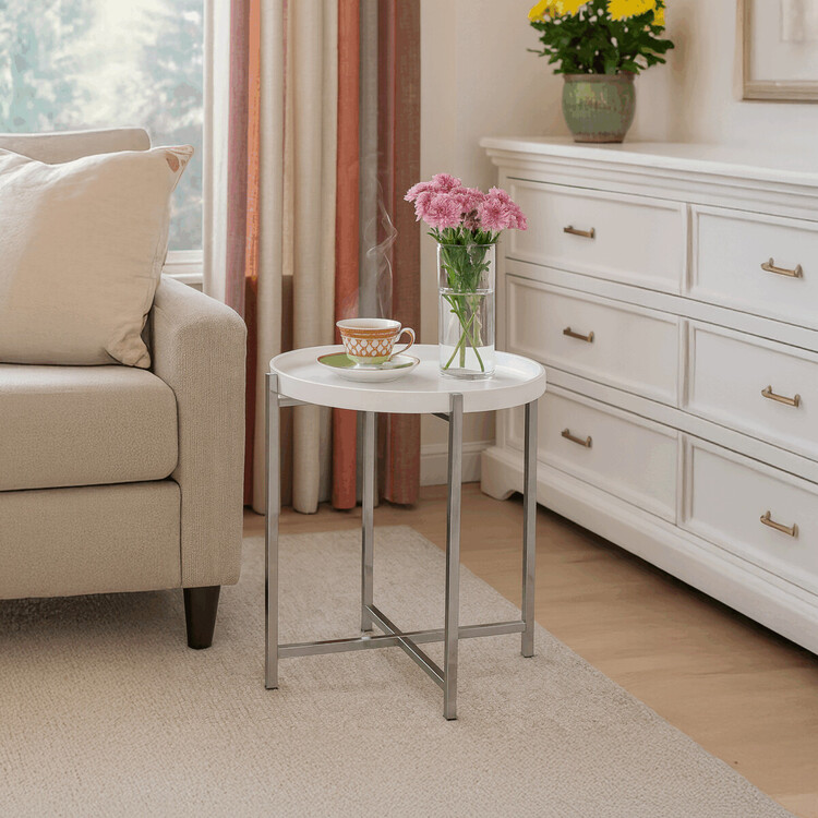 Odkládací stolek v Nordic stylu a kulatého tvaru. Konstrukce v sobě spojuje vyjímatelný dřevěný tác z bukové překližky, v bílé matné a subtilní podnoží zhotovené z kovových profilů čtvercového průřezu 1,5 × 1,5 cm v lesklém chromu. Právě tato podnož zajišťuje vysokou a dokonalou stabilitu... více informací o zboží