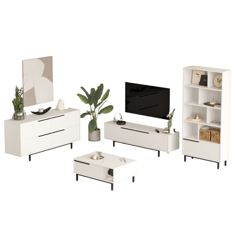 je navržena tak, aby splnila všechny vaše potřeby. Televizní stolek nabízí prostor pro multimediální zařízení, konferenční stolek slouží jako ideální místo pro občerstvení nebo dekorace, prostorná komoda poskytuje úložné místo pro různé předměty a knihovna je perfektním místem pro uložení knih, rostlin nebo dekorací. Díky preciznímu zpracování a modernímu designu se stane dominantou vašeho obývacího pokoje.