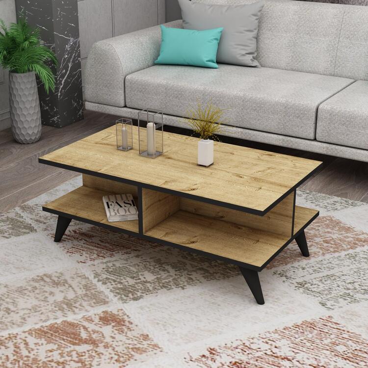 Konferenční stolek kombinuje funkčnost a moderní design, který dokonale zapadne do každého obývacího pokoje. Díky svému nízkému vzhledu a praktické odkládací polici nabízí ideální prostor pro odložení časopisů, ovladačů nebo jiných předmětů. Stylová kombinace dubu a černé barvy podtrhne estetiku vašeho interiéru.