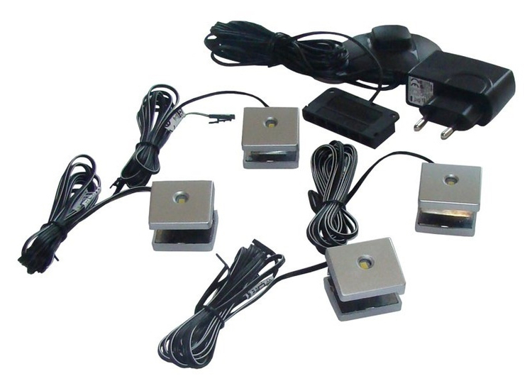 Osvětlení skleněných polic vitríny obsahuje: 4 x světelný bod (neutrální, bílé, LED),3 směry šíření světla – nahoru, dolů a na polici, 1 x transformátor, dotykový spínač pro desku.CASA 75001