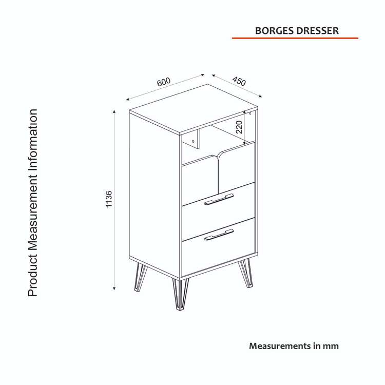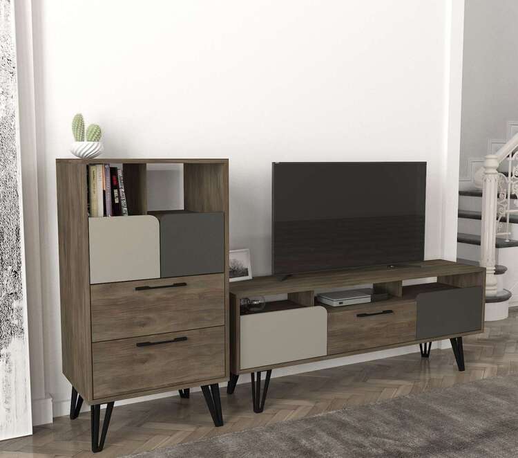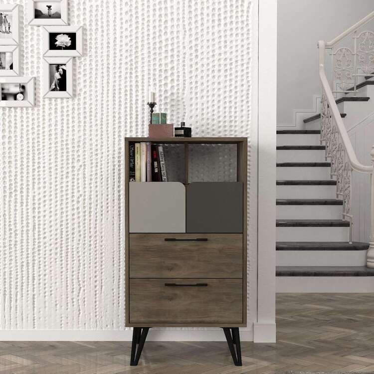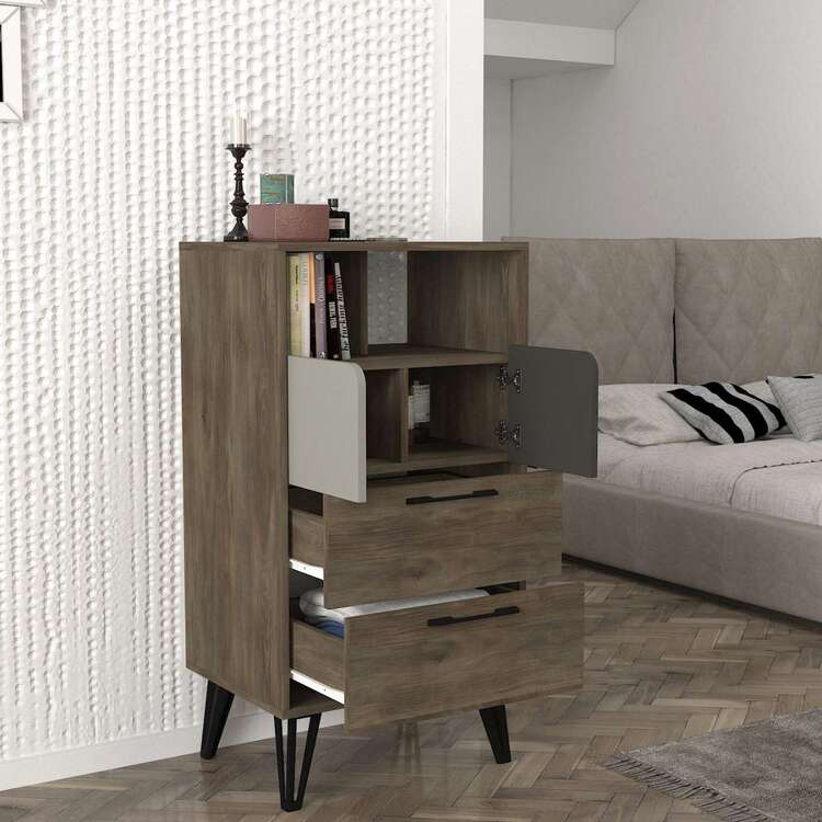 Komoda se vyznačuje moderním provedením v elegantní kombinaci šedé, béžové a antracitové barvy, která snadno zapadne do jakéhokoliv interiéru. Vysoký vzhled komody poskytuje dostatek úložného prostoru díky dvěma zásuvkám, skříňce a regálku, což vám umožní efektivně uspořádat všechny vaše věci.