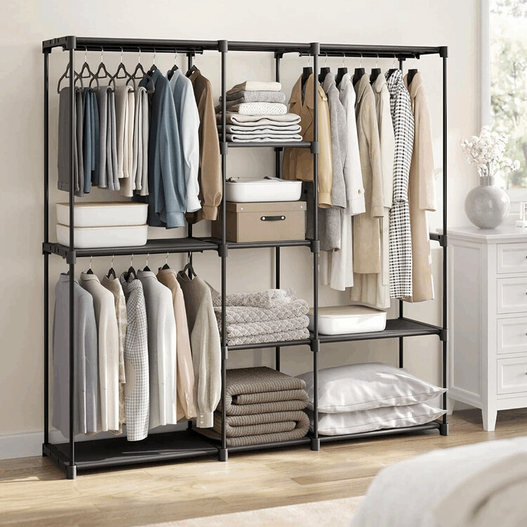 Otevřená šatní skříň v černém provedení nabízí praktické řešení úložného prostoru pro oděvy a doplňky. Je vyrobena z pevného kovu s plastovými a látkovými prvky, které zajišťují stabilitu a snadnou údržbu. Konstrukce obsahuje několik polic a věšáků, které umožňují efektivní organizaci oblečení, včetně zavěšení košil, kabátů či sukní. Díky otevřenému designu je přístup k uloženým věcem rychlý a přehledný, což usnadňuje každodenní používání. Rozměry a nosnost odpovídají potřebám běžné domácnosti či kanceláře.