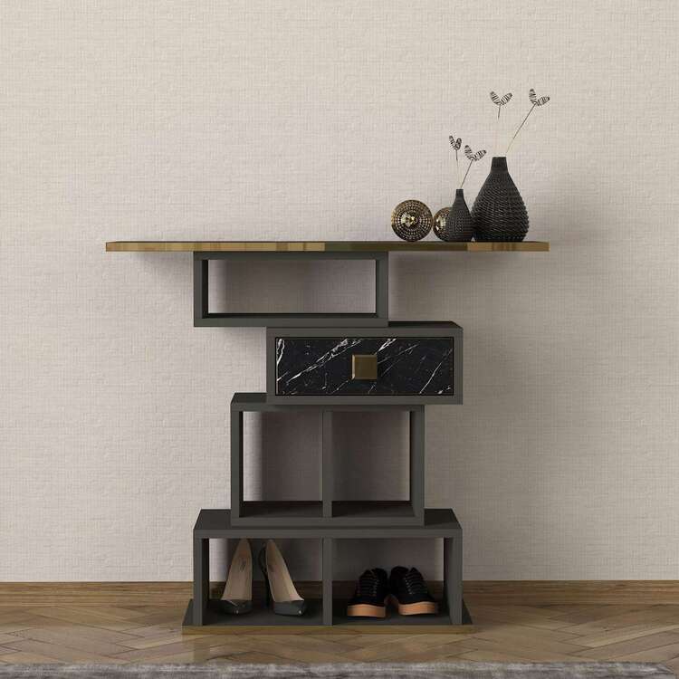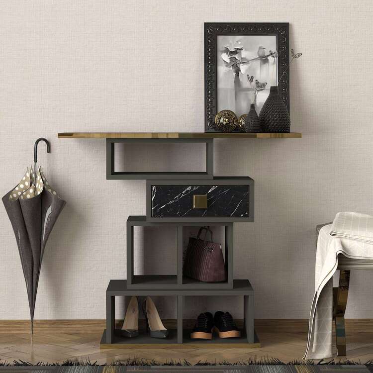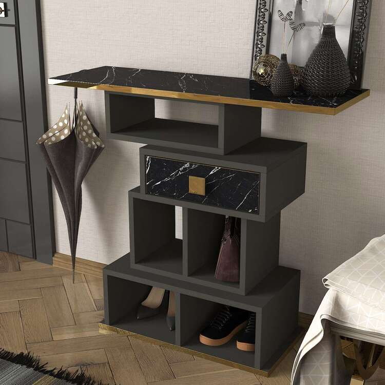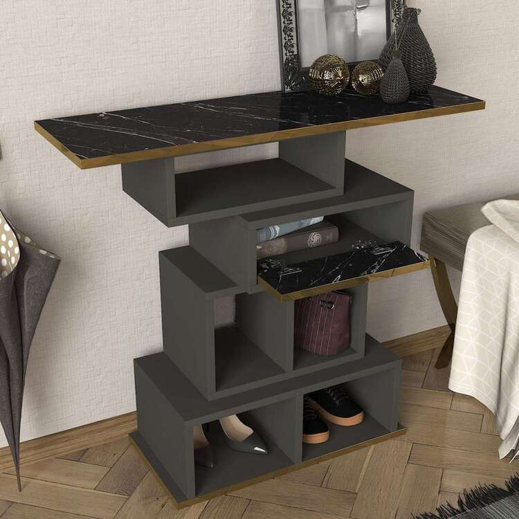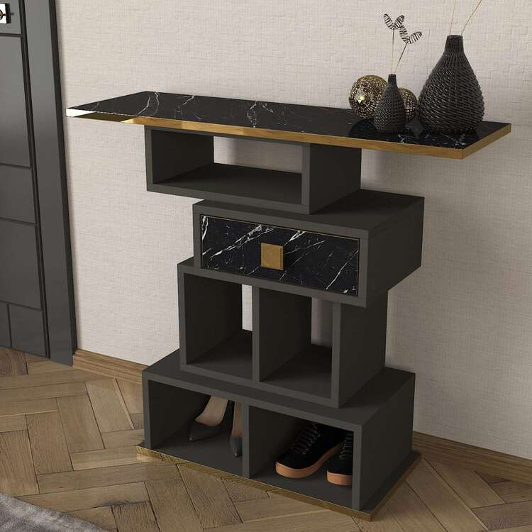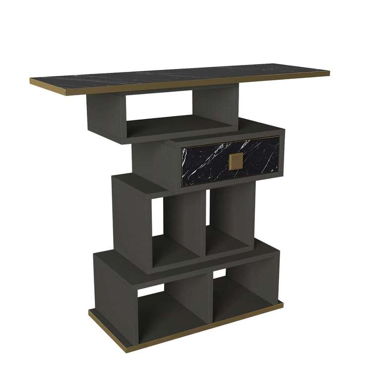 Elegantní a stylový konzolový stolek je ideálním doplňkem pro váš obývací pokoj nebo předsíň. Tento luxusní stolek je vyroben z kvalitního materiálu LTD a jeho design v antracitové barvě s černým mramorovým vzorem přidá vašemu interiéru sofistikovaný vzhled.