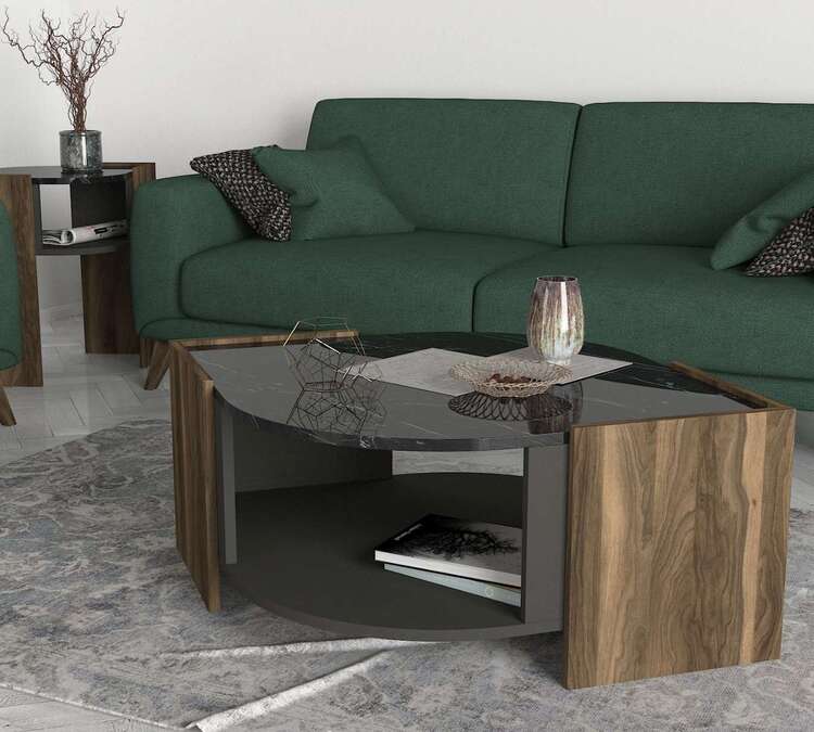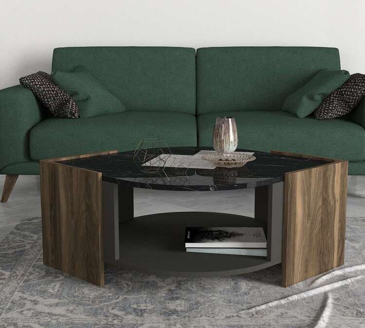 Konferenční stolek je ideální volbou pro ty, kteří hledají moderní a funkční nábytek s neobvyklým designem. Jeho kombinace ořechové a mramorové barvy a minimalistický design přinášejí do vašeho domova svěžest a moderní styl, zatímco poskytují dostatek úložného prostoru pro všechny vaše potřeby.