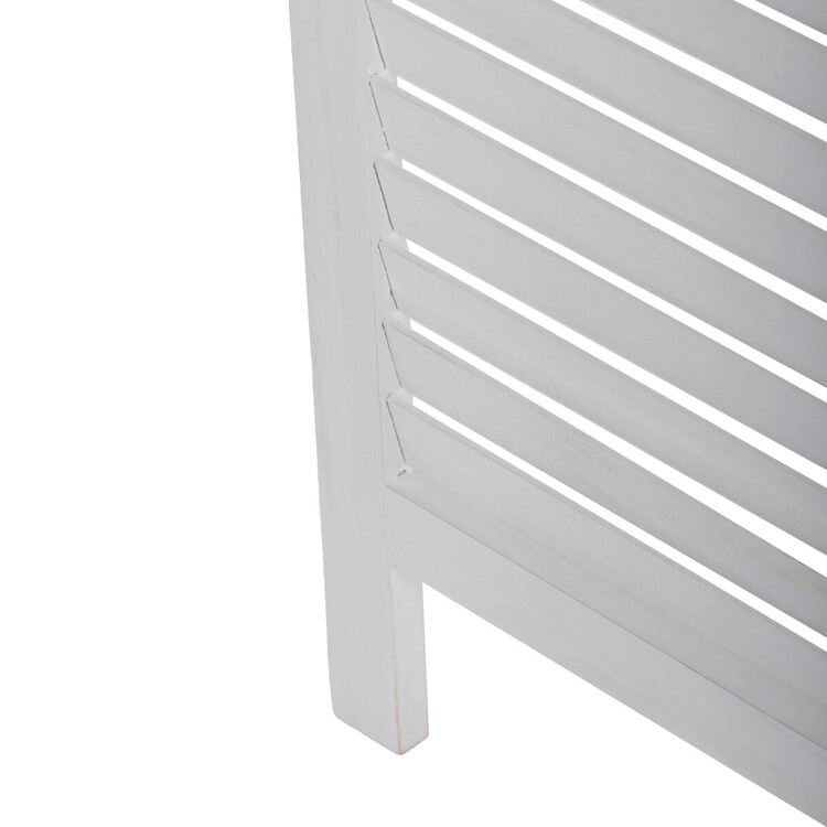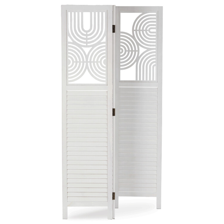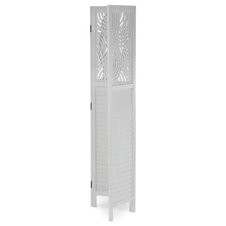 Třípanelový paraván vyrobený z masivního smrkového dřeva v bílé barvě nabízí praktické řešení pro rozdělení prostoru v interiéru. Každý díl je doplněn dekorativními výřezy v horní části, které propouštějí světlo a zároveň zachovávají soukromí. Masivní materiál zajišťuje pevnost a stabilitu, zatímco přírodní textura dřeva dodává výrobku přirozený vzhled. Paraván je vhodný pro použití v obývacích pokojích, ložnicích nebo kancelářích, kde pomáhá vytvořit útulné a funkční prostředí. Díky skládací konstrukci je snadno přemístitelný a skladovatelný.