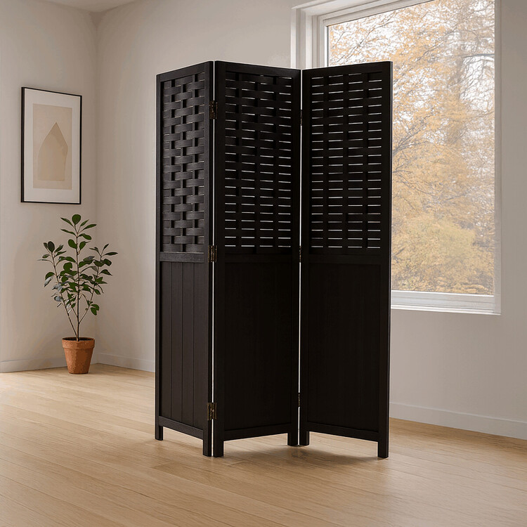 Třídílný paraván z masivního smrkového dřeva v černém provedení nabízí praktické řešení pro rozdělení prostoru s výrazným přírodním dekorem. Horní část tvoří propletené lamely, které propouštějí světlo a zároveň zajišťují dostatečnou míru soukromí, spodní část je tvořena plnou deskou s... více informací o zboží