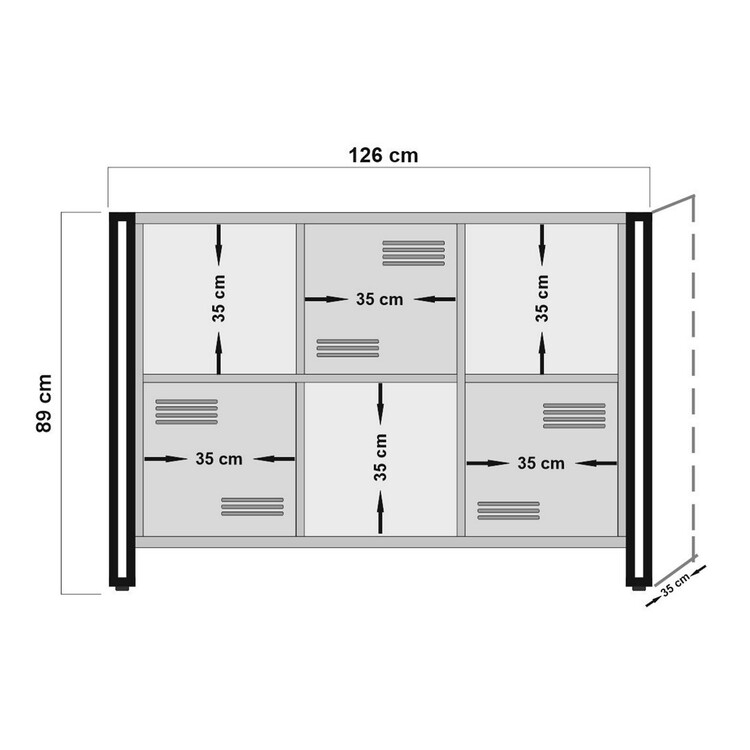 Knihovna je navržena pro efektivní ukládání a organizaci vašich věcí. Obsahuje tři plná dvířka pro diskrétní úložný prostor a dvě police pro vystavení knih, dekorací nebo rostlin. Kovové úchytky a industriální design přidávají knihovně moderní charakter.