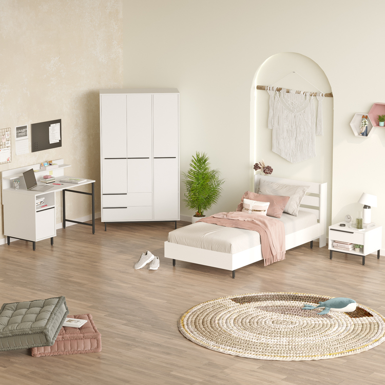 kombinuje pohodlí a praktičnost. Postel poskytuje komfortní místo pro spánek, noční stolek je ideální pro lampičku nebo knihy, šatní skříň nabízí dostatek úložného prostoru pro oblečení a psací stůl zajišťuje ideální pracovní prostor pro studium nebo tvoření. Díky promyšlenému designu je tato sestava skvělým řešením pro organizovaný a stylový dětský pokoj.
