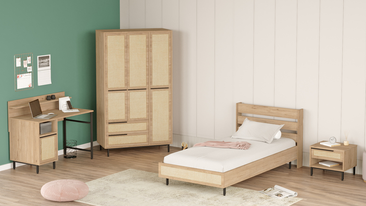 kombinuje pohodlí a praktičnost. Postel poskytuje komfortní místo pro spánek, noční stolek je ideální pro lampičku nebo knihy, šatní skříň nabízí dostatek úložného prostoru pro oblečení a psací stůl zajišťuje ideální pracovní prostor pro studium nebo tvoření. Díky promyšlenému designu je tato sestava skvělým řešením pro organizovaný a stylový dětský pokoj.