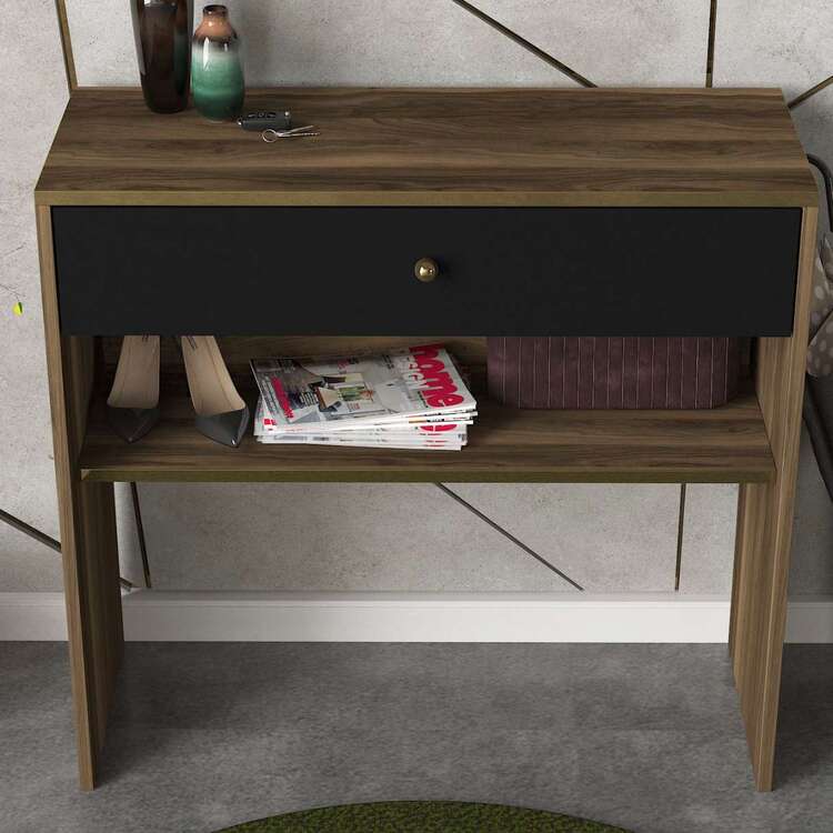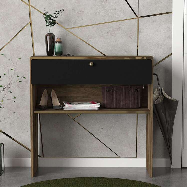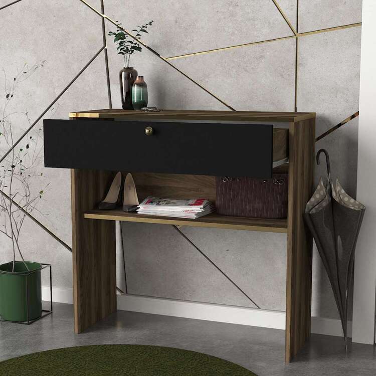 Konzolový stolek nabízí praktickou odkládací polici, která je ideální pro uložení vašich dekorací, knih nebo dalších drobností. Jeho obdélníkový tvar a kombinace ořechové a černé barvy přidává do každého interiéru sofistikovaný a moderní vzhled.