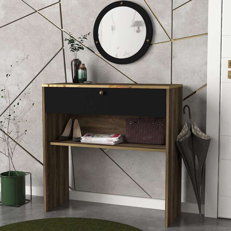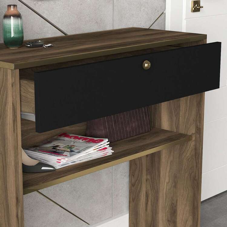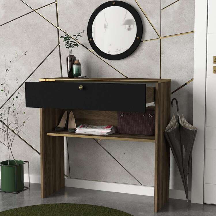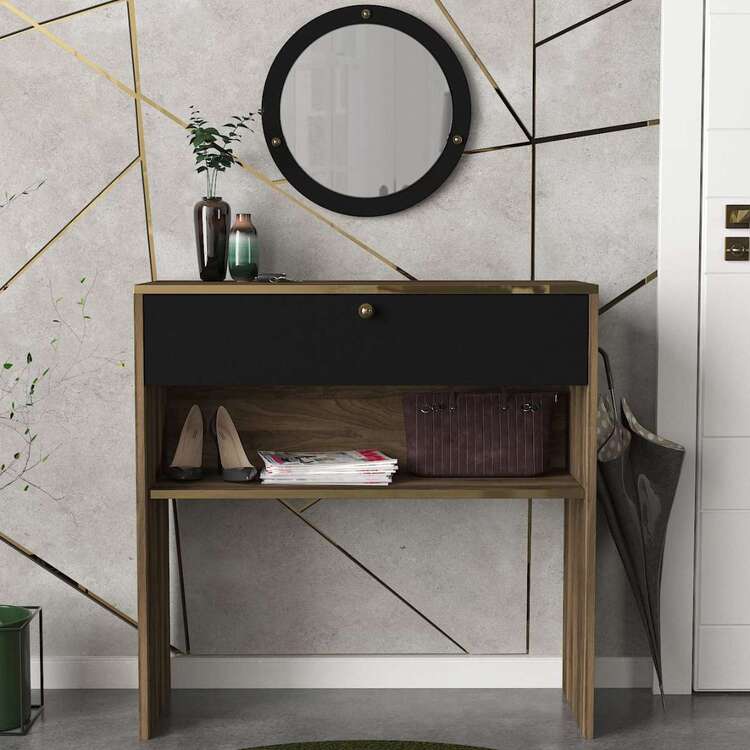 Konzolový stolek vyniká svým elegantním designem v kombinaci ořechové a černé barvy, který dodá vašemu interiéru sofistikovaný vzhled. Praktická odkládací police nabízí dostatek prostoru pro vaše dekorace a drobnosti, zatímco nástěnné zrcadlo opticky zvětšuje a prosvětluje místnost.