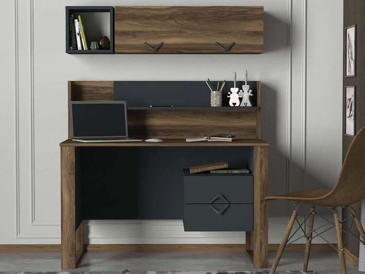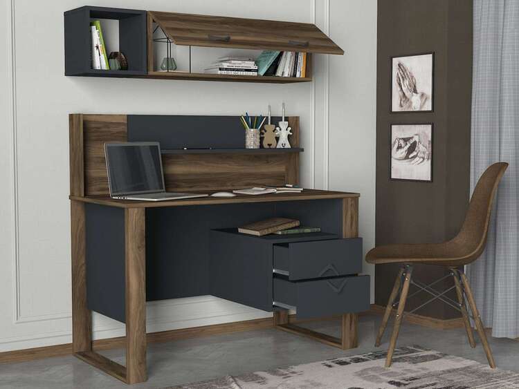 Písací stůl je vyroben z kvalitního LTD materiálu s tloušťkou 18 mm, což zajišťuje jeho pevnost a dlouhou životnost. Elegantní kombinace ořechové a antracitové barvy dodává stolu moderní a stylový vzhled, který se hodí do jakéhokoliv interiéru. Stůl je vybaven odkládacími policemi a dvěma zásuvkami, které poskytují dostatek úložného prostoru pro vaše pracovní potřeby a pomůcky.