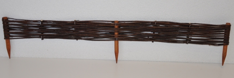 Plůtek z vrbového proutí. | Materiál plůtku je přírodní vrbové proutí zapletené mezi upevňovací dřevené kolíky.Nadzemní výška plůtku je 10 cm.Délka plotového dílce je 1 metr.