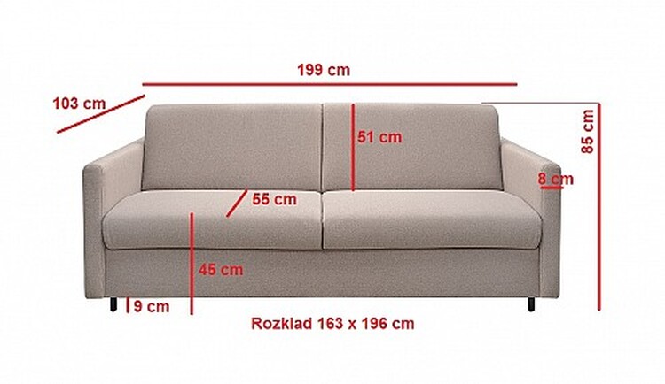 Po rozložení vznikne lůžko o rozměrech 163 × 196 cm (celková
