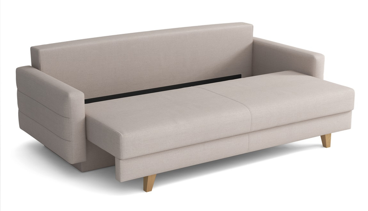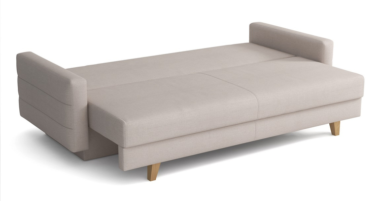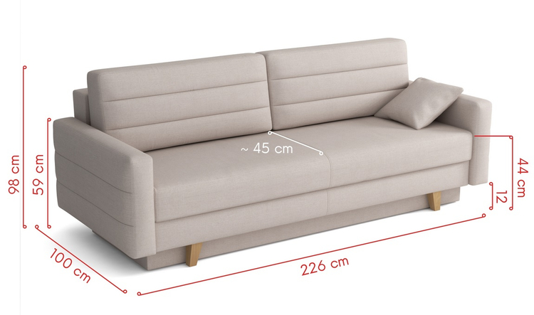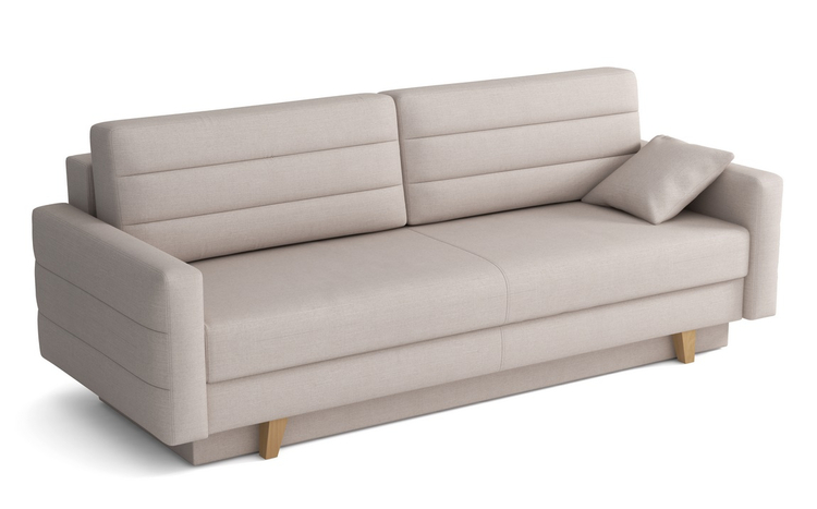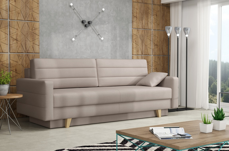 Elegantní rozkládací pohovka moderního vzhledu s dekoračním prošíváním odnímatelných polštářů. Pohovka má úložný prostor a také prostor pro příležitostní spaní, plocha po rozložení činí 200 × 143 cm. Rozklad je jednoduchý – povytažením sedací části vpřed a sklopením zadní opěrky. Pohodlné sezení zaručuje kombinace PUR pěny a bonelových pružin. Výška sedu je 44 cm, hloubka sedu je cca 45 cm. Výška zadní opěrky je 59 cm, s polštáři 98 cm. Nožky jsou dřevěné v přírodní barvě, výška 12 cm. Barevné provedení – látka v barvě béžové.CASA 34018