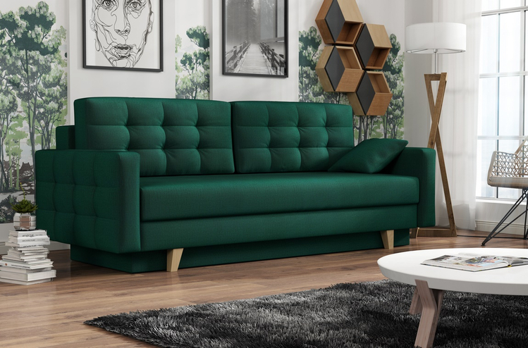 Elegantní rozkládací pohovka moderního vzhledu s dekoračním prošíváním odnímatelných polštářů. Pohovka má úložný prostor a také prostor pro příležitostní spaní, plocha po rozložení činí 200 × 143 cm. Rozklad je jednoduchý – povytažením sedací části vpřed a sklopením zadní opěrky. Pohodlné sezení zaručuje kombinace PUR pěny a bonelových pružin. Výplň opěrných polštářů tvoří kombinace PUR pěny a silikonových kuliček. Výška sedu je 44 cm, hloubka sedu je cca 45 cm. Výška zadní opěrky je 59 cm, s polštáři 98 cm. Nožky jsou dřevěné v přírodní barvě, výška 12 cm. Barevné provedení – látka v barvě zelené.CASA 34016