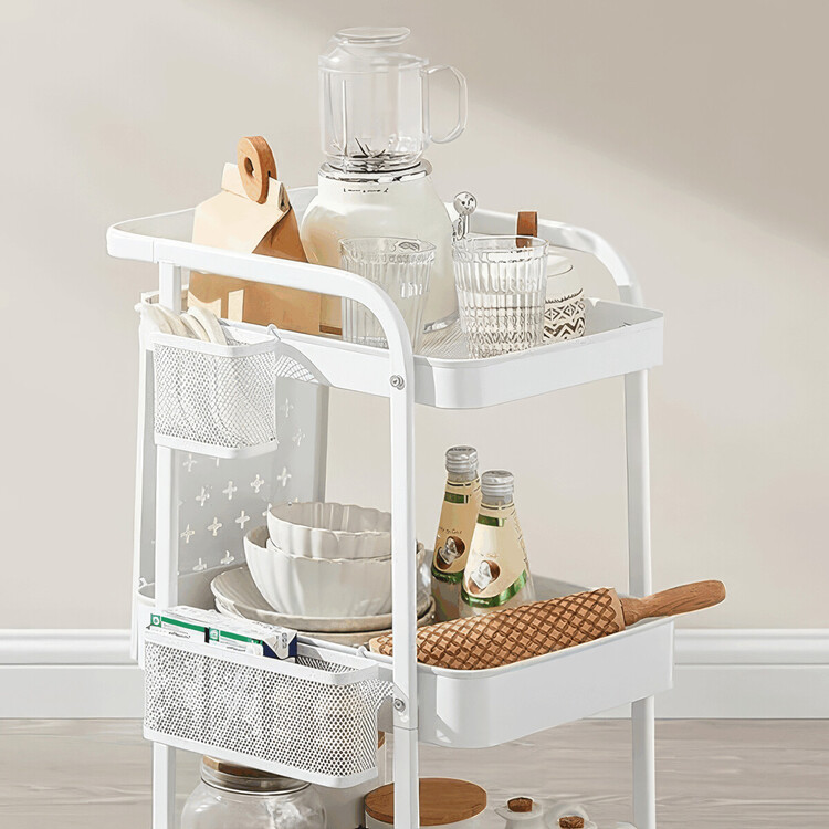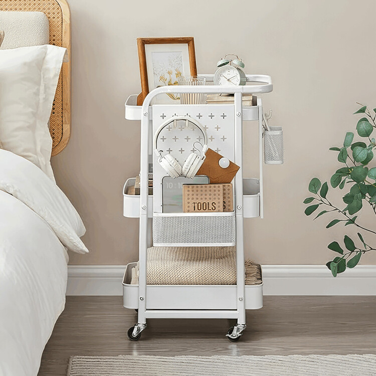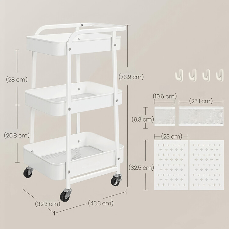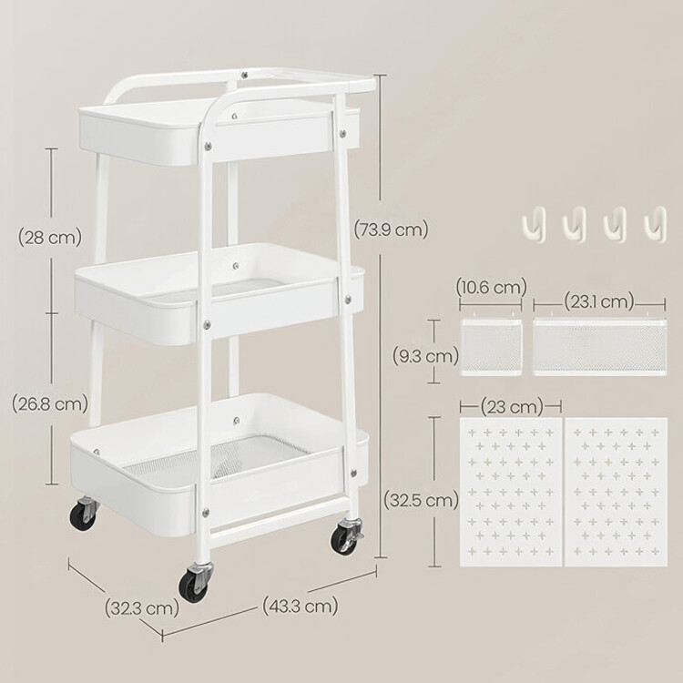 Pojízdný úložný vozík v bílém provedení je vyroben z pevného kovu s práškovým lakem, který zajišťuje odolnost proti poškrábání a snadnou údržbu. Konstrukce nabízí tři prostorné police s perforovanými bočními panely, které umožňují připevnění doplňkových košíků a háčků pro efektivní organizaci... více informací o zboží