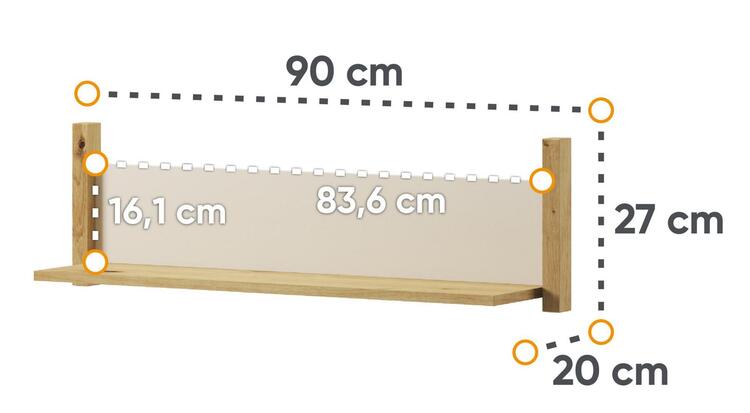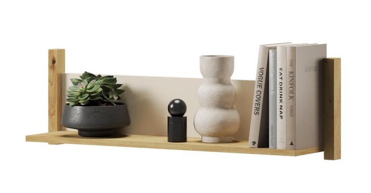 Závěsná police. Rozměry viz obrázek. Tento sektorový nábytek nejen pro teenagery působí nejen příjemně, ale má i svůj specifický charakter. Je vyroben z kvalitní LTD 16 mm hraněné ABS páskou. Jemné spojení pískového béžového a dekoru v barvě dub artisan činí tuto kolekci nejen stylovou, ale... více informací o zboží