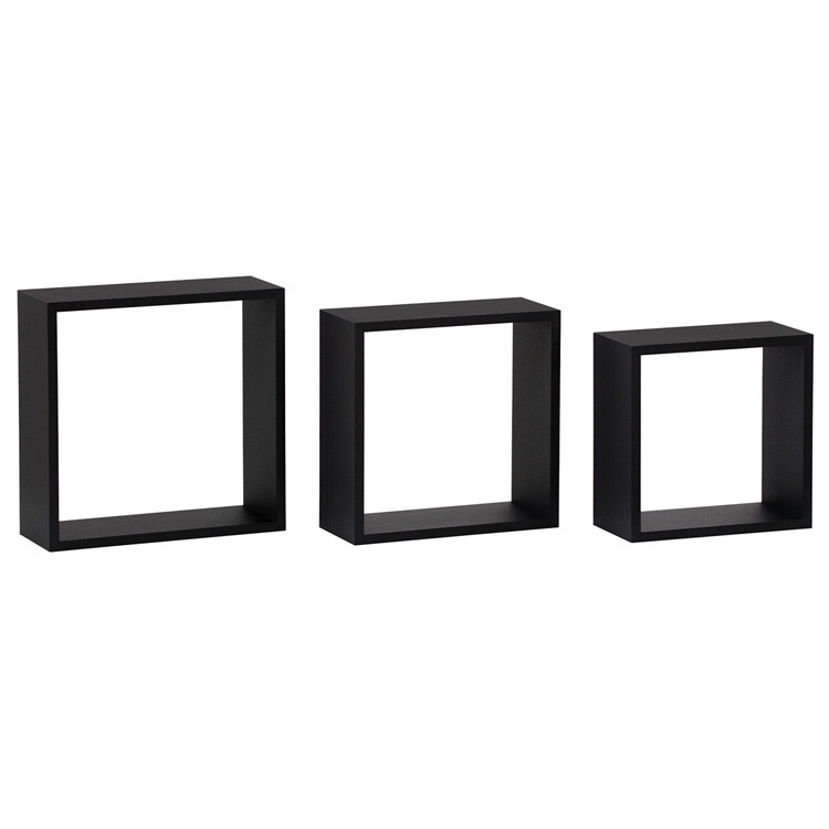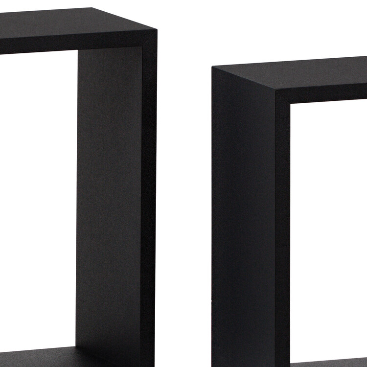 Sada tří nástěnných poliček v matné černé barvě je vyrobena z MDF materiálu, který nabízí kvalitní zpracování a snadnou údržbu. Poličky mají jednoduchý, moderní design s čistými liniemi a hranami, které podtrhují jejich minimalistický vzhled. Různé velikosti jednotlivých kusů umožňují variabilní uspořádání na stěně podle potřeby a prostoru. Jsou vhodné pro vystavení dekorací, knih nebo drobných předmětů a díky pevnému provedení zajistí stabilní oporu. Balení obsahuje ochrannou fólii pro bezpečnou manipulaci a přepravu.