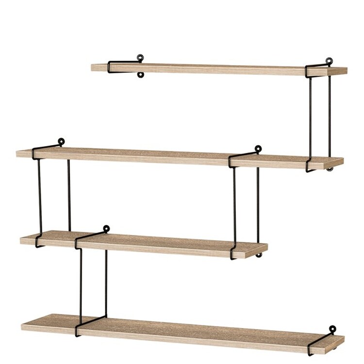 Nástěnné poličky o šířce 80 cm kombinují desky z MDF s dekorativním dubovým dekorem a černými matnými kovovými nosnými vzpěrami, které zajišťují stabilitu a pevnost. Jednoduché a praktické provedení umožňuje snadné upevnění na stěnu a nabízí dostatek odkládacího prostoru pro dekorace, knihy či drobné předměty. Povrch desek je hladký s příjemnou texturou dubového dřeva, která přináší do interiéru přírodní odstíny a vizuální efekt dřeva. Poličky jsou navrženy tak, aby byly skladné a zároveň funkční, což oceníte v různých typech prostor od obývacích pokojů po kanceláře. Černé kovové prvky doplňují celkový industriální vzhled a zvyšují nosnost celé sestavy.
