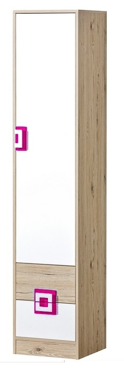 Policová jednodveřová skříň NIKO ze sektorové řady, která se vyznačuje netradičním zpracováním barev a originalitou úchytů. Tento styl nábytku zaujme každou mladší generaci. Skříň je vyrobena z kvalitní LTD desky hraněné ABS lištou. Korpus je v barvě dub jasný, dveře jsou v kombinaci barev bílá mat / dub jasný. Úchytky jsou v barevné kombinaci růžová / bílá. Ve skříni jsou tři police a ve spodní části jsou 2 zásuvky. Sektorový nábytek NIKO má široký výběr prvků, který Vám zaručí sestavit si dětský nebo studentský pokoj, ložnici či kancelář podle svých potřeb, přání a představ. Dodáváme v demontovaném stavu.CASA 23004