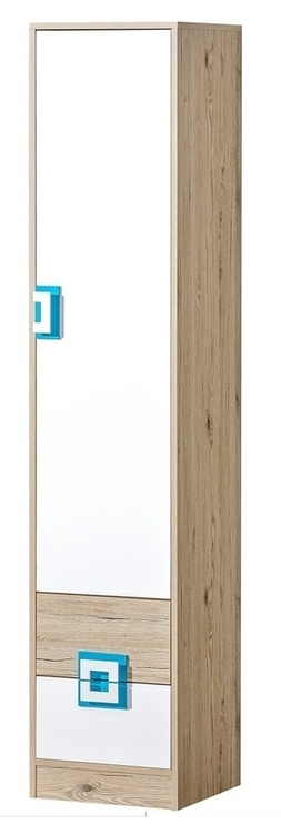 Policová jednodveřová skříň NIKO ze sektorové řady, která se vyznačuje netradičním zpracováním barev a originalitou úchytů. Tento styl nábytku zaujme každou mladší generaci. Skříň je vyrobena z kvalitní LTD desky hraněné ABS lištou. Korpus je v barvě dub jasný, dveře jsou v kombinaci barev bílá mat / dub jasný. Úchytky jsou v barevné kombinaci tyrkys / bílá. Ve skříni jsou tři police a ve spodní části jsou 2 zásuvky. Sektorový nábytek NIKO má široký výběr prvků, který Vám zaručí sestavit si dětský nebo studentský pokoj, ložnici či kancelář podle svých potřeb, přání a představ. Dodáváme v demontovaném stavu.CASA 23004