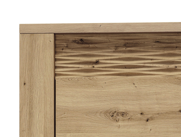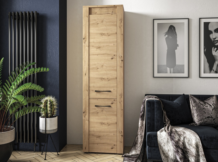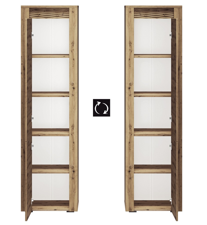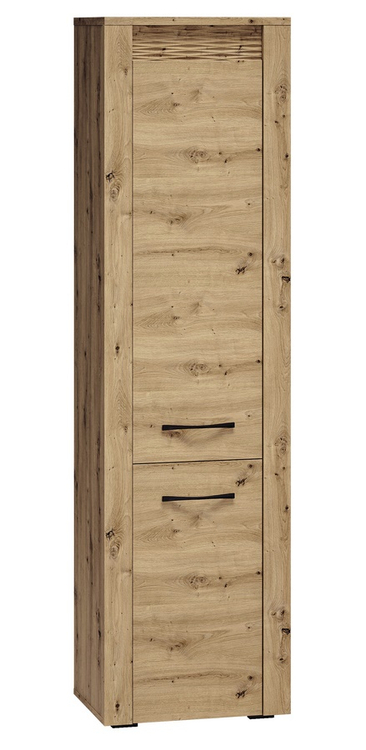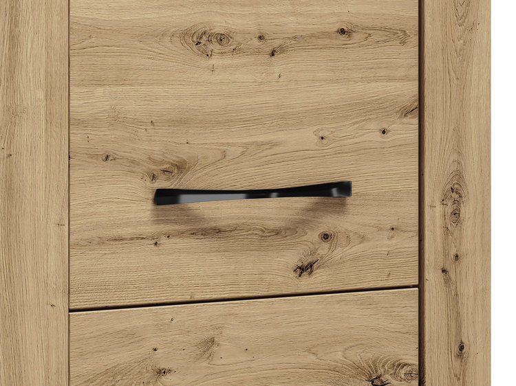 Policová skříň dvoudveřová je vyrobena z kvalitní desky LTD hraněné ABS páskou v barvě dub artisan. Dekorační riflovaná lišta nahoře je z MDF. Dvířka jsou vybaveny systémem tichého dovírání a je možné je namontovat na pravou nebo levou stranu. Úchyty jsou kovové černé. Dodáváme v demontovaném stavu.CASA 56004