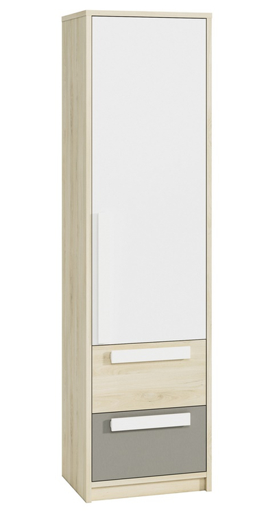 Policová skříň se dvěma zásuvkami v moderním provedení. Korpus je vyroben z kvalitní desky LTD hraněné ABS páskou v barvě buk fjord, dvířka a zásuvka jsou vyrobeny z desky LTD v kombinaci barev buk fjord/bílá/šedá. Dvířka je možné namontovat na pravou nebo levou stranu. Úchyty jsou dřevěné bílé. Dodáváme v demontovaném stavu.CASA 56010