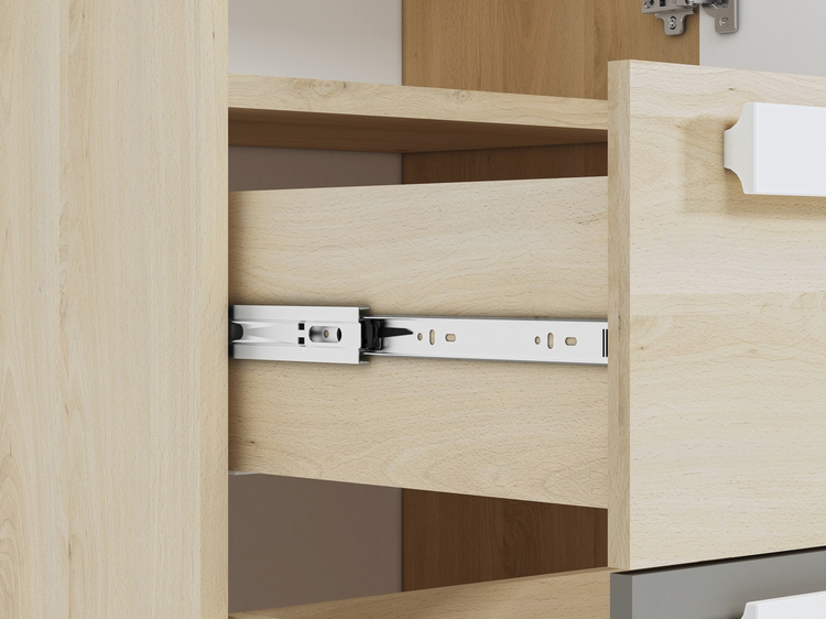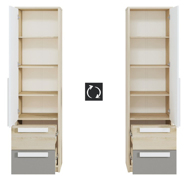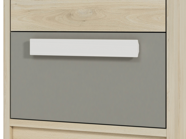 Policová skříň se dvěma zásuvkami v moderním provedení. Korpus je vyroben z kvalitní desky LTD hraněné ABS páskou v barvě buk fjord, dvířka a zásuvka jsou vyrobeny z desky LTD v kombinaci barev buk fjord/bílá/šedá. Dvířka je možné namontovat na pravou nebo levou stranu. Úchyty jsou dřevěné... více informací o zboží