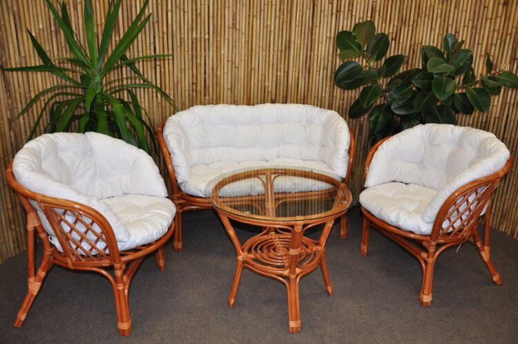 Souprava náhradních polstrů na Soupravu Bahama velká v provedení dle obrázku | Souprava se skládá z polstrů na 2 křesla Bahama a pohovku Bahama.Materiál potahové látky 100% bavlna, výplň molitan.Polstry lze prát ručně na 40 oC nebo čistit v čistírně.Polstry jsou vyráběny v České republice.Sedák křesla je kruhový a má průměr 50 cm.Opěrka křesla je široká 115 cm a její výška je 40 cm.Sedák pohovky má velikost 96 × 50 cm, opěrka pohovky má velikost 157 × 40 cm