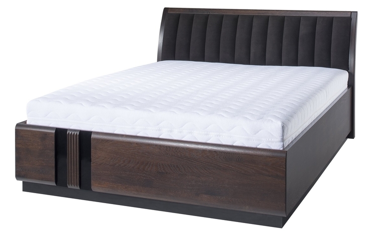 Postel 160 × 200 ze sektorové řady PORTI. Systém je exkluzivní kolekce navržena v moderním duchu. Struktura ušlechtilého masivního dubu na přední straně a přírodní dýha na korpusu zdůrazňuje velmi klasickou barvu čokoládový dub. Opakující se prvek riflování v kombinaci s černým sklem je... více informací o zboží
