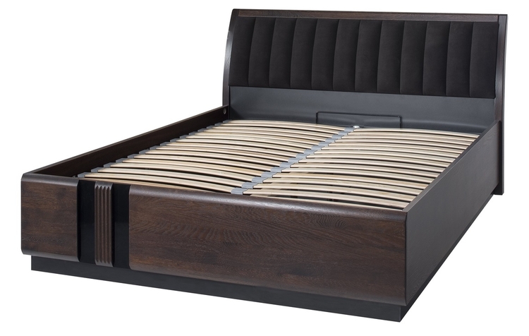 Postel 160 × 200 ze sektorové řady PORTI. Systém je exkluzivní kolekce navržena v moderním duchu. Struktura ušlechtilého masivního dubu na přední straně a přírodní dýha na korpusu zdůrazňuje velmi klasickou barvu čokoládový dub. Opakující se prvek riflování v kombinaci s černým sklem je dekorační motiv, který se odráží v každém bloku. Celá řada se vyznačuje elegancí a jednoduchými tvary, které zaručují plné využití prostoru. Barevné provedení – čokoládový dub. Čelo je potaženo kvalitní látkou imitující kůži se snadnou údržbou čistění – barva černá Carabu 33. K posteli je nutné zvlášť dokoupit rošt a matraci. Možnost dokoupit zvedací rošt s praktickým úložným prostorem. Dodáváme v demontovaném stavu.CASA 75024
