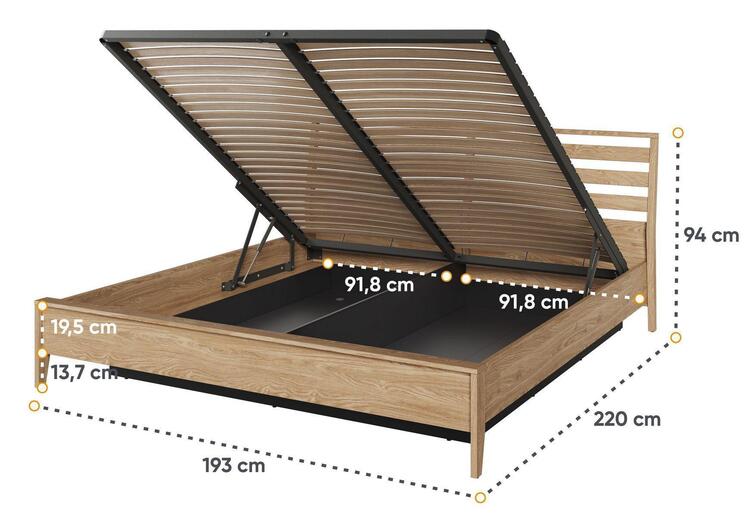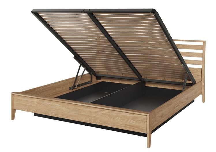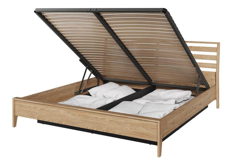 Postel s prodyšným čelem a úložným prostorem pod matrací (zvedací laťový rošt) je perfektní volbou pro ty, kteří ocení komfort a praktičnost. Pomocí tohoto úložného prostoru snadno uskladníte ložní prádlo, deky nebo polštáře, čímž šetříte místo ve skříni. Doporučujeme dokoupení polštáře na přední čelo postele pro větší pohodlí. Kolekce je příkladem pohodlí, funkčnosti a nadčasového designu. Každý kus nábytku v této kolekci je vyroben z kvalitních materiálů, které zaručují dlouhou životnost a zároveň vnášejí do vaší ložnice teplý a útulný vzhled. Díky jemným detailům, jako jsou prodyšná čela postelí, praktické úložné prostory, je každý prvek navržen tak, aby byl nejen krásný, ale i maximálně funkční. Elegantní dekor v barvě olejovaného dubu dodávají nábytku přirozený vzhled, který se snadno kombinuje s různými styly. S tímto nábytkem si vytvoříte ložnici, která bude dokonale ladit s vaším životním stylem. Vhodná matrace k dokoupení je 180×200 cm nebo 2× 90×200 cm. Dodáváme v demontovaném stavu.