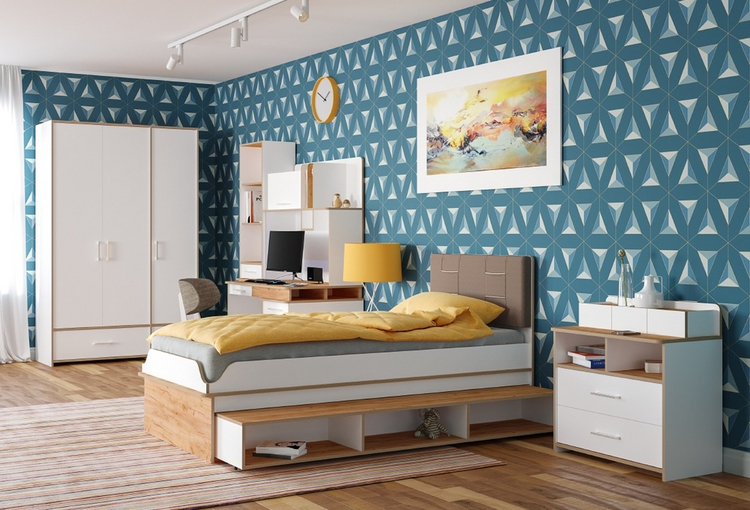 Postel 90 cm s deskovým roštem je vyrobena z desky LTD v barevném provedení bílá/dub kraft zlatý. Čelo postele je polstrováno látkou Savannah Latté. K posteli je možné dokoupit zásuvku pod postel s úložným prostorem. Matrace není součástí postele, nutno dokoupit zvlášť. Dodáváme v demontovaném stavu.DOPRODEJ!CASA 98233