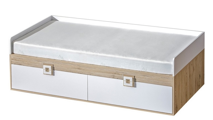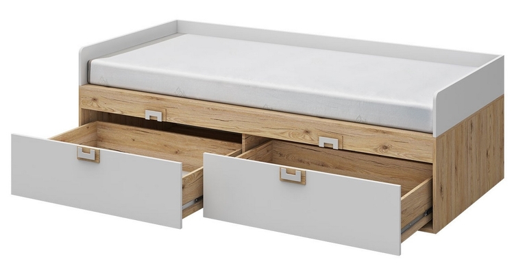 Postel s roštem a úložným prostorem ze sektorové řady NIKO, která se vyznačuje netradičním zpracováním barev a originalitou úchytů. Rošt je v ceně, matraci je třeba doobjednat, vhodný rozměr 90 × 200 cm. Tento styl nábytku zaujme každou mladší generaci. Postel je vyrobena z kvalitní LTD desky hraněné ABS lištou. Korpus je v barvě dub jasný, čela zásuvek jsou v barvě bílá mat. Úchytky jsou v barevné kombinaci dub jasný / bílá. Součástí postele jsou dvě zásuvky ve spodní části. Sektorový nábytek NIKO má široký výběr prvků, který Vám zaručí sestavit si dětský nebo studentský pokoj, ložnici či kancelář podle svých potřeb, přání a představ. Dodáváme v demontovaném stavu.CASA 23004