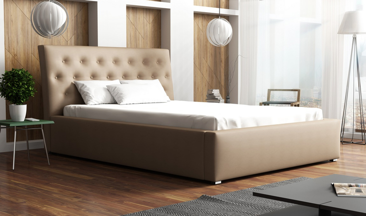 Elegantní postel s vysokým čalouněným čelem s ozdobnými knoflíky. Konstrukce je potažena ekokůží ve světle hnědé barvě. Nožky jsou plastové v šedé barvě. Rošt je v ceně, ale matrace je potřeba doobjednat, vhodný rozměr 180 × 200 cm nebo 2 x matrace 90 × 200 cm. Za příplatek je možné objednat postel s kovovým zvedacím roštem, tím vznikne pod ložnou plochou úložný prostor. Cena za postel s kovovým roštem na vyžádaní. Změnu roštu je nutné zadat při první objednávce. Výška bočnice od země je 34 cm, výška roštu od země je cca 24 cm. Dodáváme v demontovaném stavu.CASA 34001