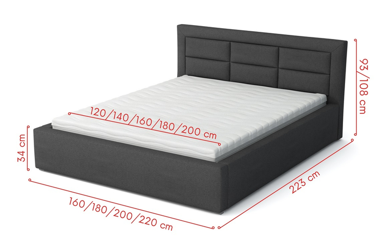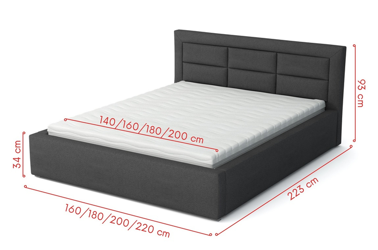 Elegantní postel s vysokým prošívaným čalouněným čelem. Nožky jsou plastové v šedé barvě. Rošt je v ceně, ale matrace je potřeba doobjednat. Vhodný rozměr matrace je 140 × 200 cm. Za příplatek je možné objednat postel s kovovým zvedacím roštem, tím vznikne pod ložnou plochou úložný prostor. Cena za postel s kovovým roštem na vyžádaní. Změnu roštu je nutné zadat při první objednávce. Výška bočnice od země je 34 cm, výška roštu od země je cca 24 cm. Dodáváme v demontovaném stavu.CASA 34002