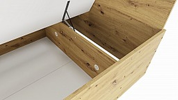 Jednolůžková postel BOR je navržena pro každého, kdo hledá funkční aprostorově úsporné řešení bez kompromisu na vzhled. Díky výklopnémuroštu získáte snadný přístup k velkému úložnému prostoru, ideálnímupro ložní prádlo, přikrývky nebo sezónní oblečení.