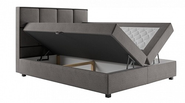 Součástí postele je také úložný prostor přístupný pomocí bočníhovýklopu, který se hodí například pro ložní prádlo nebo sezónní textil.Celková konstrukce působí kompaktně a díky nízkým kovovým nožkámvýšky 3 cm působí postel stabilně a pevně. Matrace o rozměru 2 ×80 × 200 cm je v ceně. Topper není součástí.